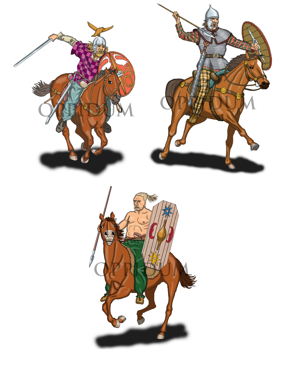 - Les Celtes (Gaulois ou Bretons) présentent les 3 types de fantassins: un homme protégé par une cotte de mailles, qui sera reprise par les Romains sous le nom de Lorica hamata, un homme torse nu et un autre totalement nu, avec des peintures à signification religieuse.